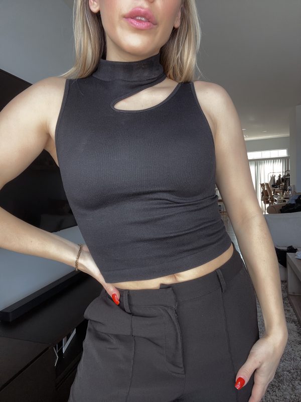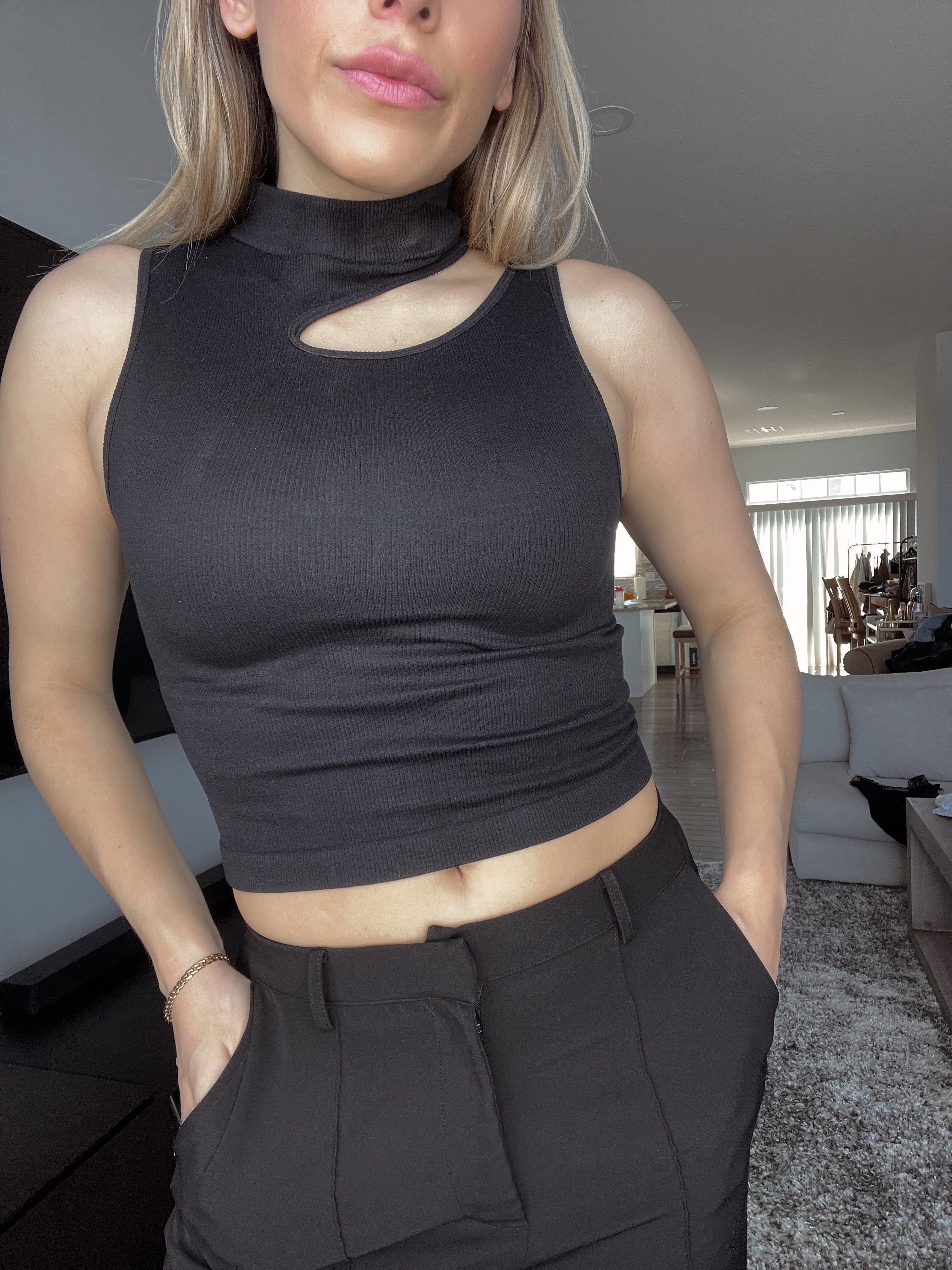 BombshellShort Sleeve Tank is a one size fits mostshort sleeve midi top. This tank comes in black and is a great closet basic to have. This top isa little cropped and has a ribbed design to it. The BombshellShort Sleeve Tank has a mock neck design with a cute cut out around the neck and shoulder.