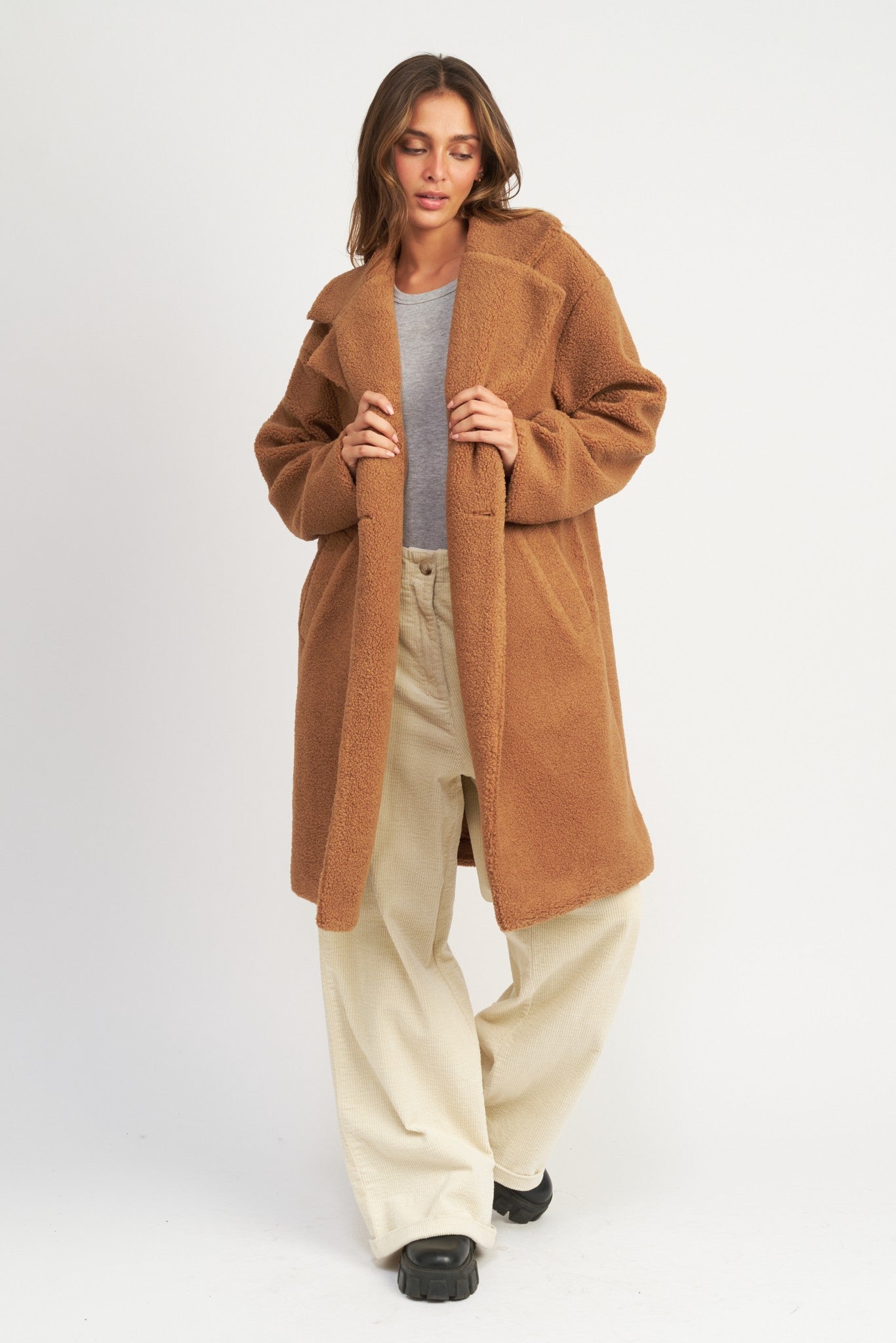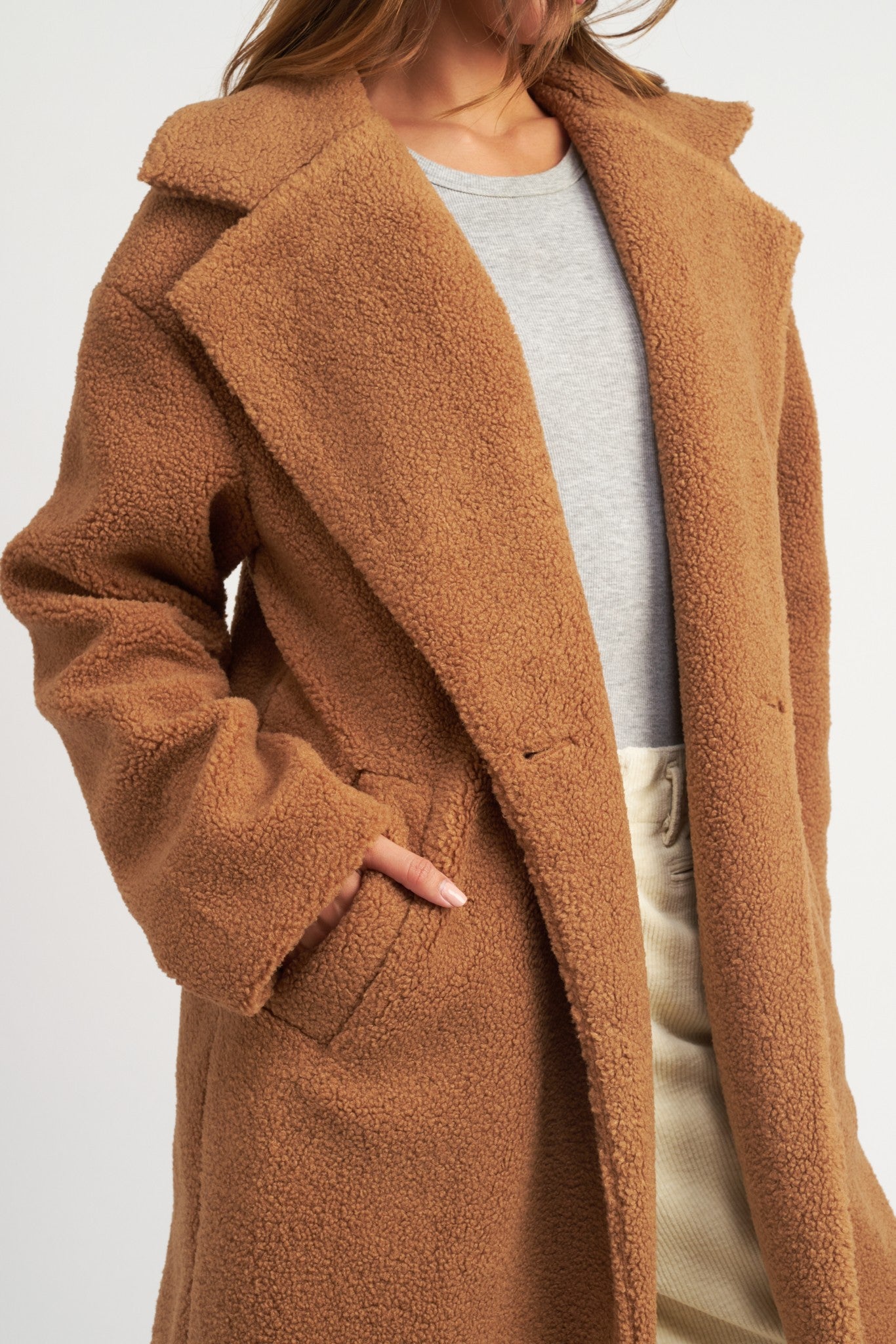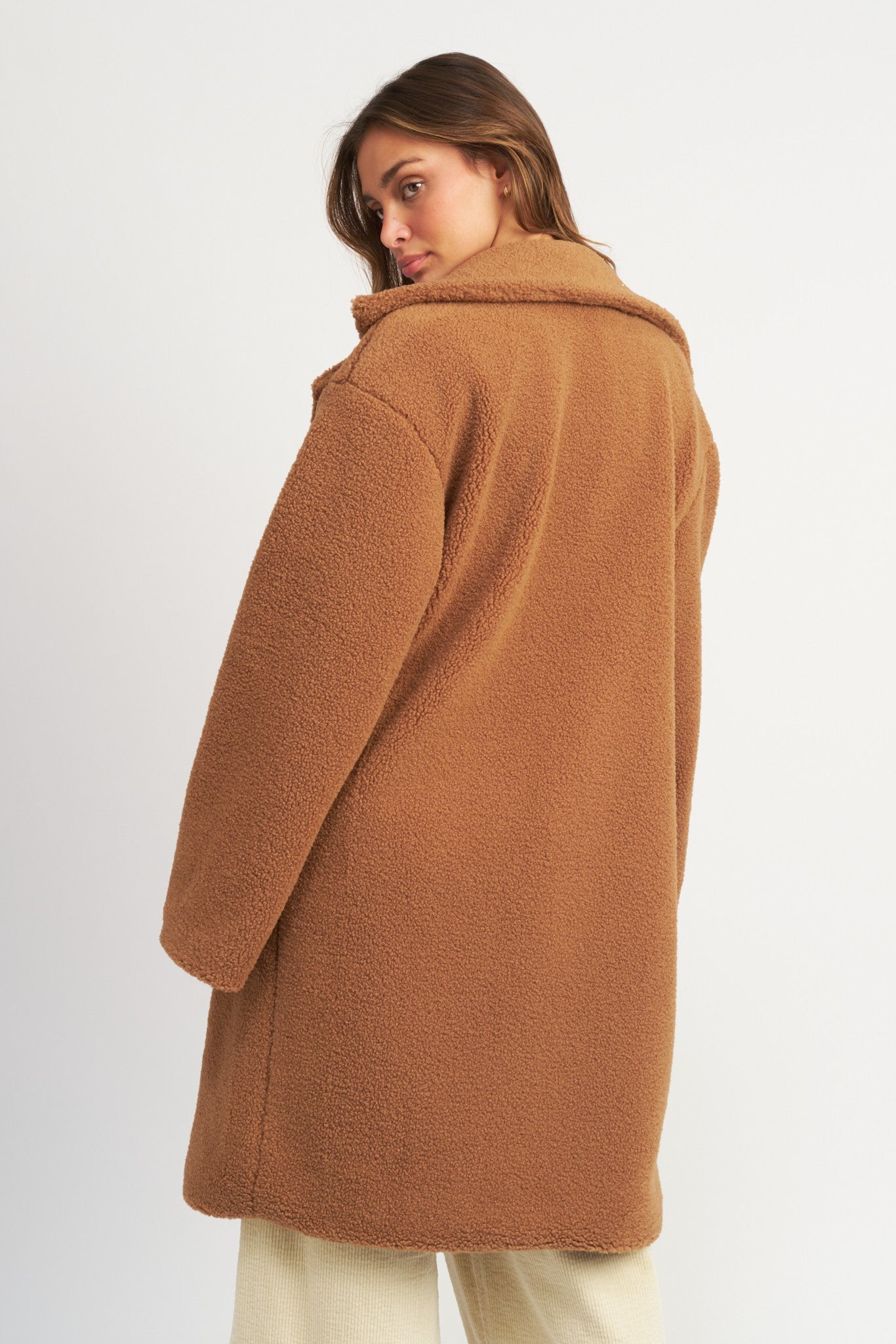 Defined by its trendytrench coat silhouette, the Chelsea Teddy Coat brings warmth and comfort to your wardrobe. Crafted with a luxuriously soft teddy texture, the rust colored coat features a double breast collar and a long fitted profile for a classic look.
