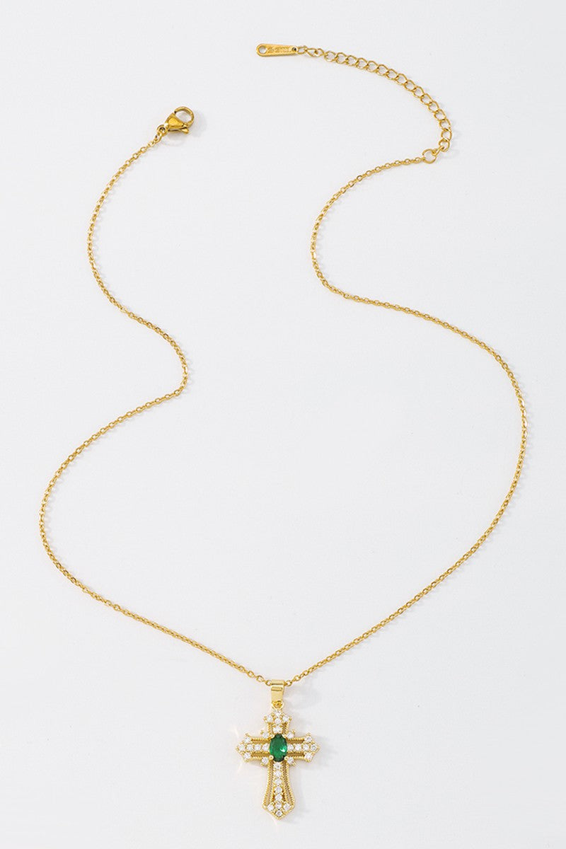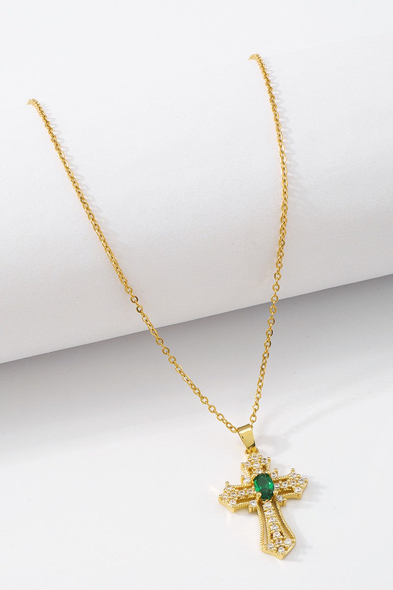 Cross Pendant Necklace is the new stunning pendant statement piece you need in your jewelry collection. This stunning pendant is the ultimate statement piece with its cubic zirconium and emerald green colored cross design. The chain and pendant are plated copper and is waterproof and tarnish free.
