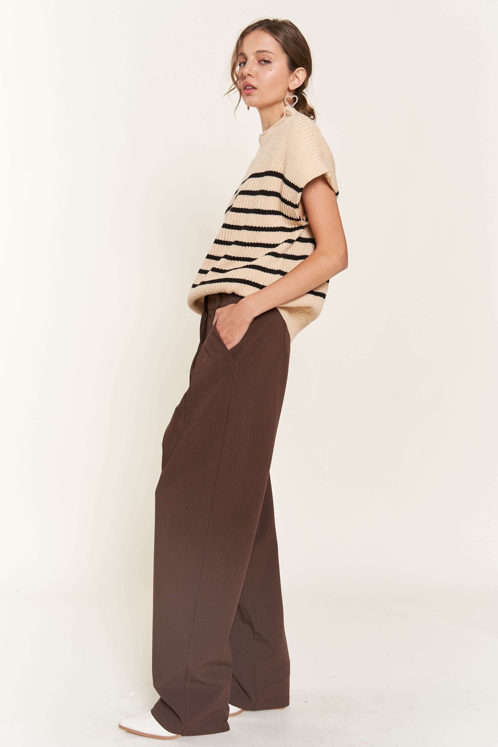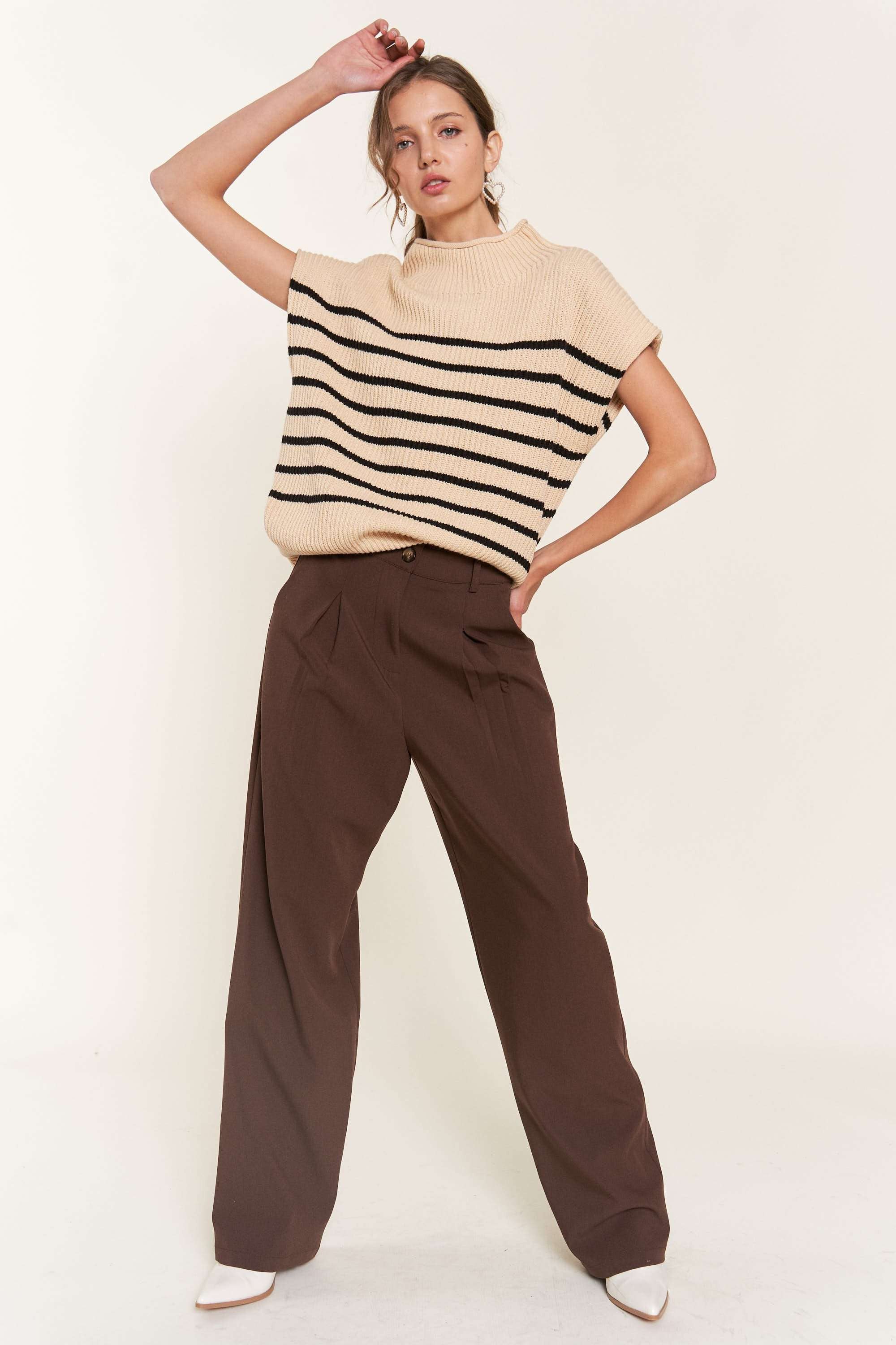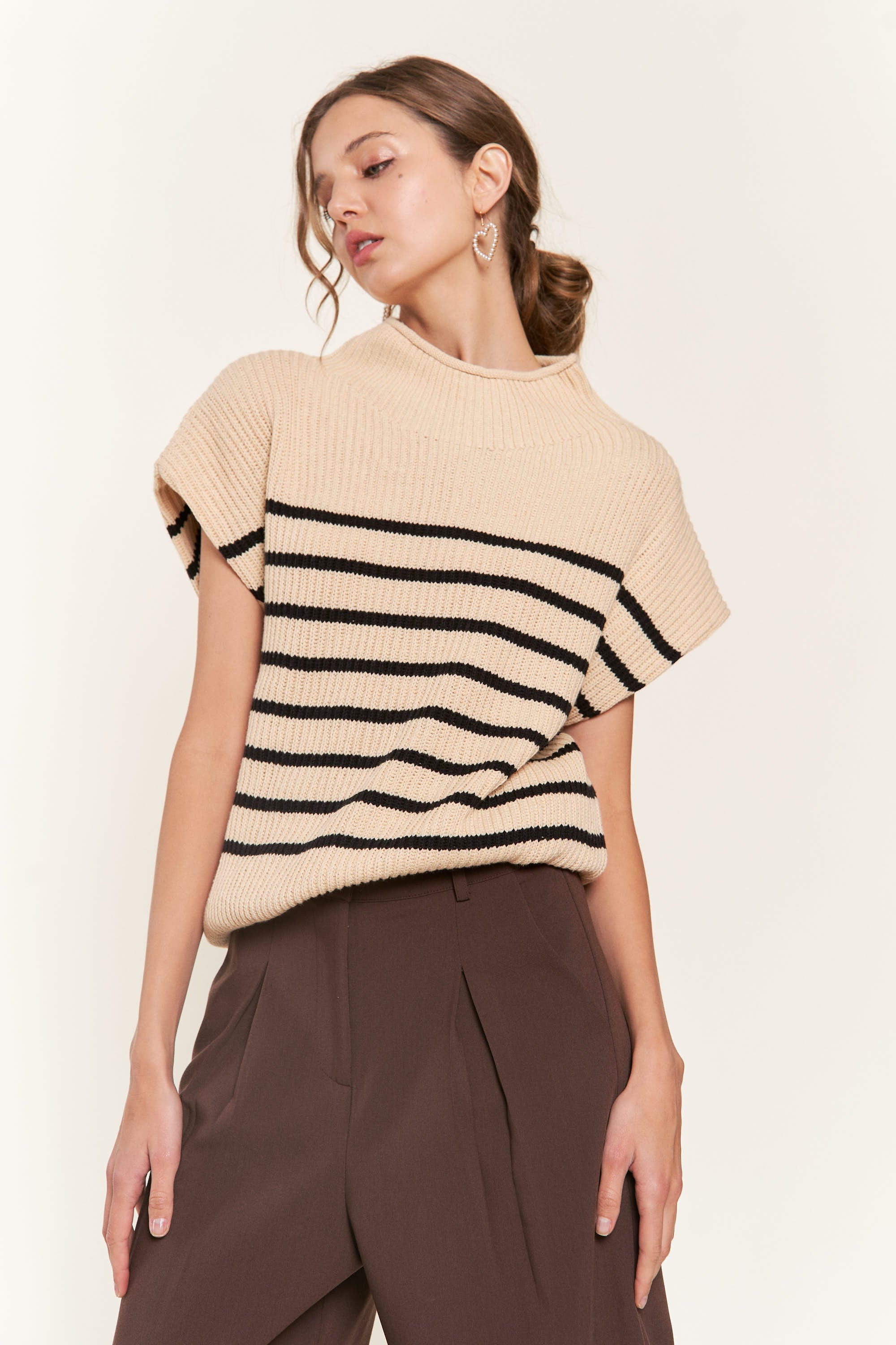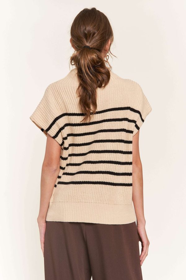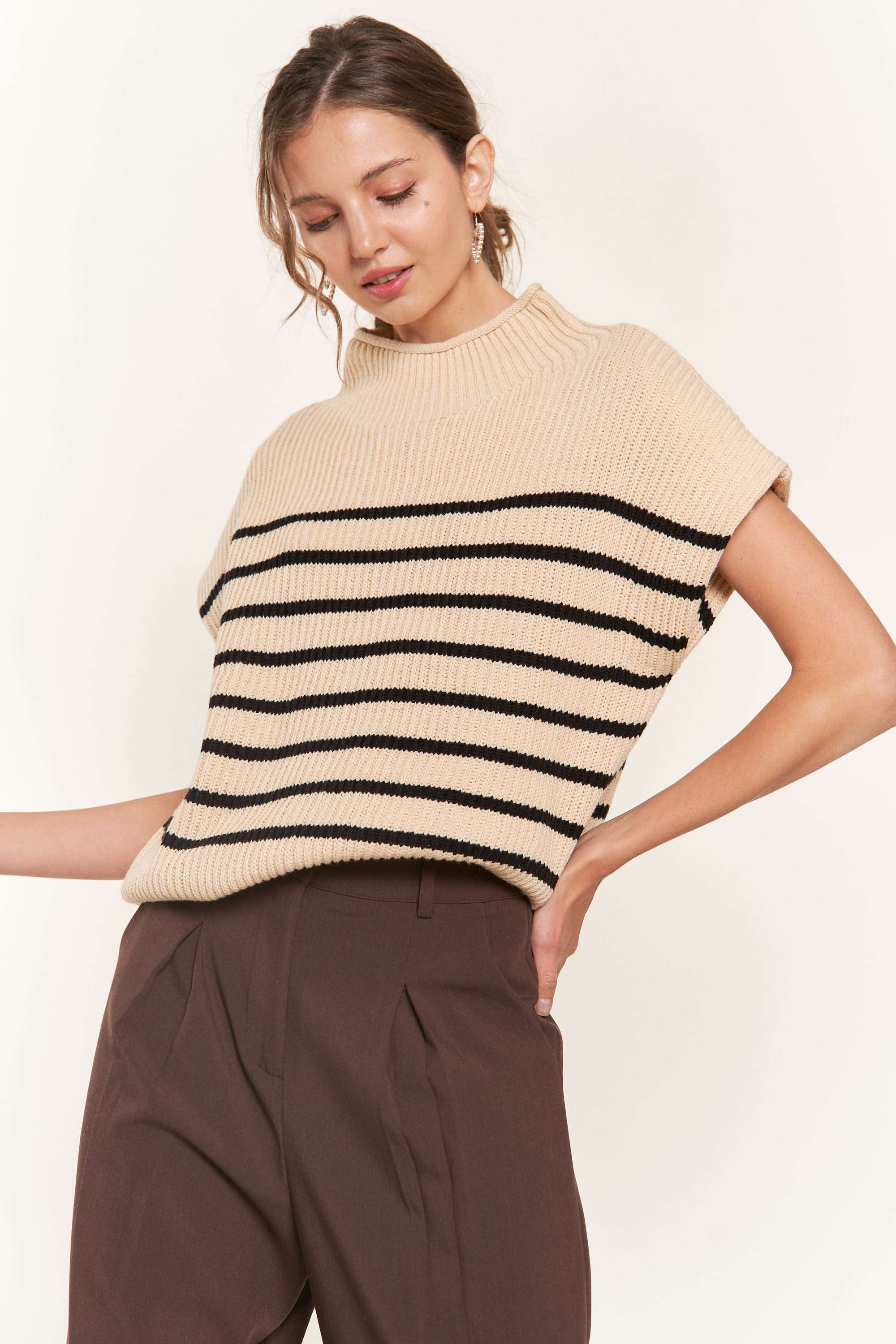 This Girl Next Door Sweater is the perfect addition to your cold-weather wardrobe. It features a beige short sleeve sweater with black stripes, and can also be worn as a sweater vest. Crafted with both fall and winter in mind, you’ll stay comfortable and stylish all season long.