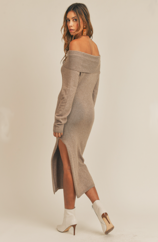The Katie May Sweater Dress is the perfect fall and winter sweater dress for all body types. This sweater dress has a fold over off the shoulder design and comes in this beautiful taupe color. This sweater dress is so cozy and has two sexy slits on the sides.