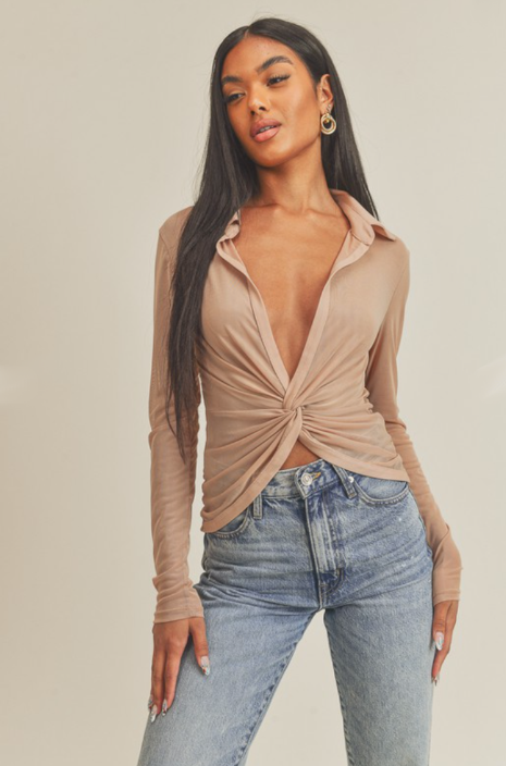 Macy Mesh Tie Top is a see through sexy sheer long sleeve that can be styles so many different ways. This sheer mesh top features a deep V neck with a twist tie detail in the front. This tophas a collared top and can easier be dressed up or down.