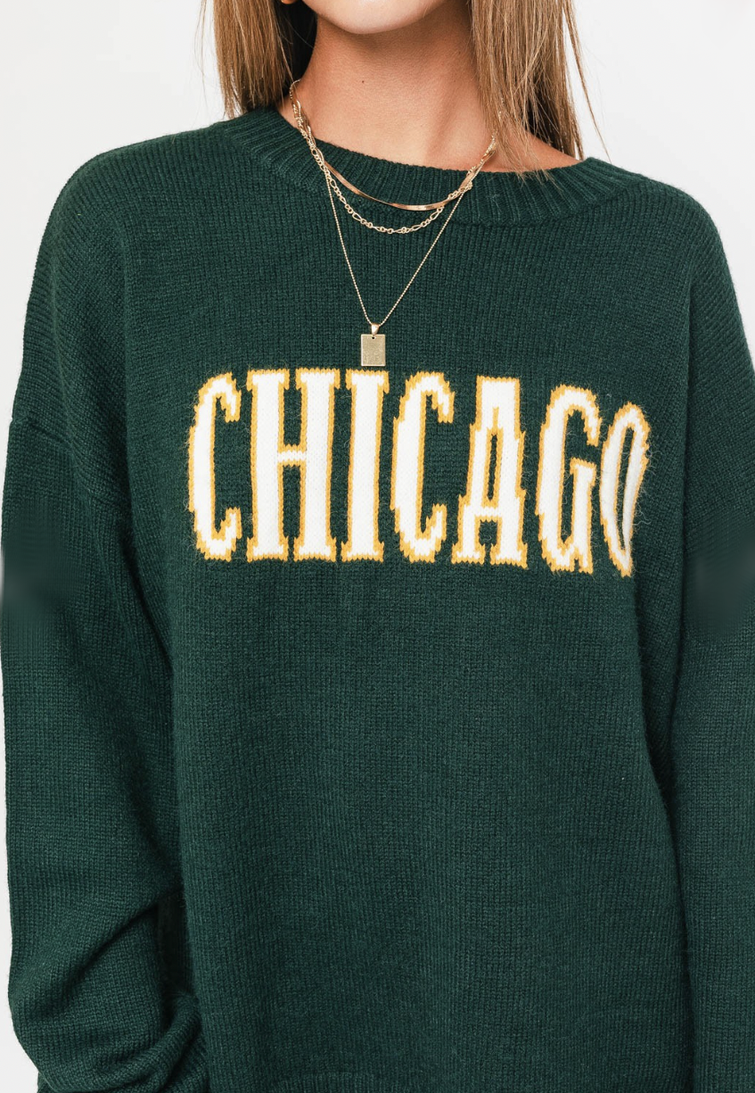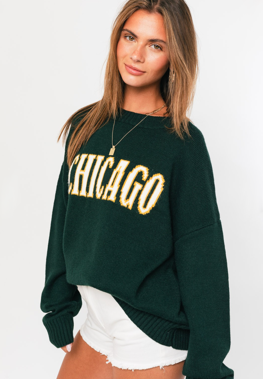 Sweet Home Chicago Sweater is our new long sleeve round neck sweater that has our home’s name on it “Chicago.” This sweater comes in dark hunter green and the letters Chicago come in white with a yellow border around it. This sweater is slightly oversized and can be styled up or down. BARE RAGS headquarters and home is Chicago, so we decided to get a limited edition sweater to show our love for this city.